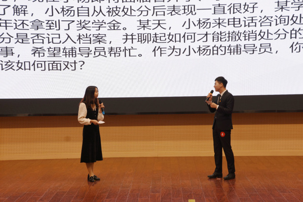 比赛分“案例研讨”和“谈心谈话”等环节。案例研讨主要考察辅导员分析问题、思考问题、研判问题、解决问题以及理论学习应用能力。本次案例分析环节采用“我提问,你回答”的形式开展研讨,参赛选手现场提前10分钟抽题,由同组两位选手围绕案例共同辨析原因、研讨对策,总结规律。