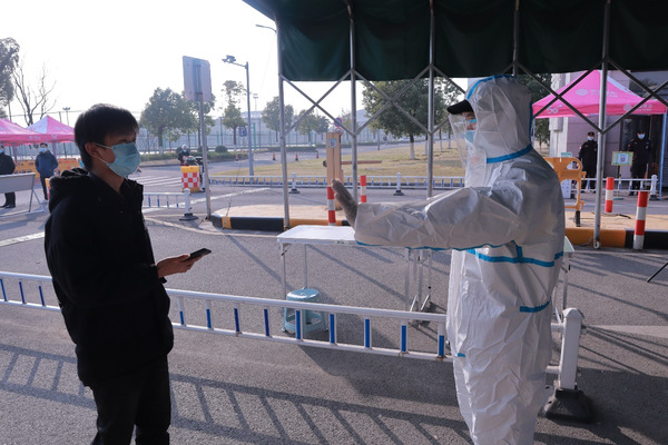 所有进校人员必须严格遵守疫情防控要求,佩戴口罩,完成“一量二查三扫码”所有审查程序,任一环节出现异常情况,均不予入校。“同学,请先测量体温。”测温人员已经身着防护服,手握测温枪,在南门20米缓冲区内等待为入校人员检测体温。入校人员依次在缓冲区内出示个人健康码与行程码,经检查后随专人进入相应通道,进行扫码登记,进入校园。