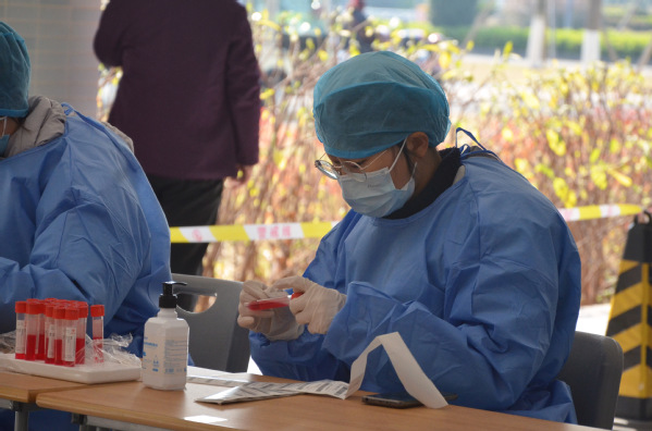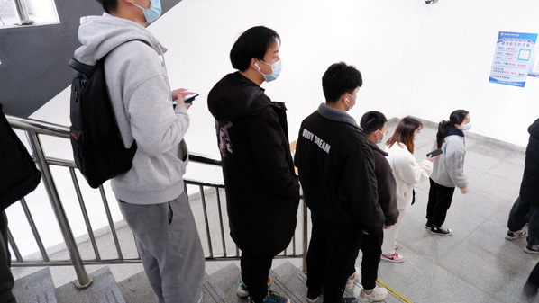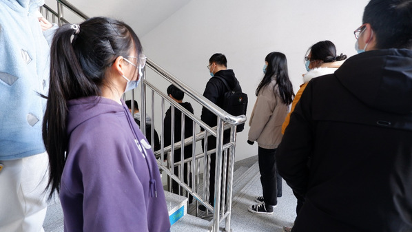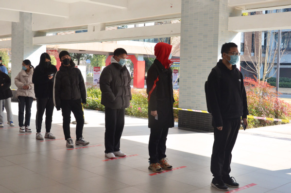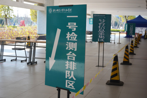 警戒线拉起,志愿者就位,工作人员在缓冲区内迅速穿上防护服,医护人员摆好试管与棉签等工具,全员整装待发,核酸检测严阵以待。师生们紧张却不失秩序地迅速集合,排队,在志愿者引导下,佩戴口罩,间隔“一米线”,在等候区内有序等待。