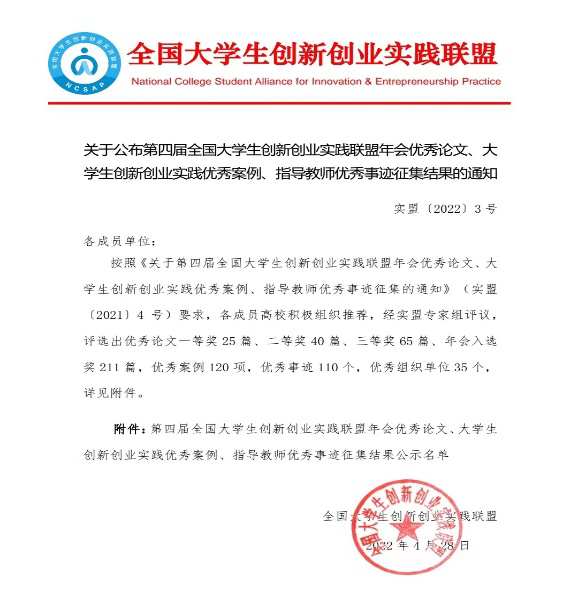 附件:《关于公布第四届全国大学生创新创业实践联盟年会优秀论文、创新创业实践优秀案例、指导教师优秀事迹征集结果的通知》