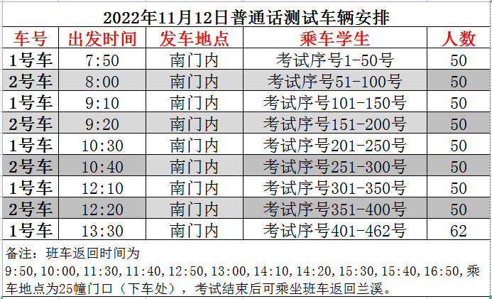 二、因疫情防控两校区学生班车停开,为方便考生,学院安排了往返兰溪校区至师大校园的车辆,供考生自愿乘坐。考生按学院规定履行进出校园手续后,按指定时间在行政楼前上车。(经咨询考点,因疫情防控,非师大本部学生不能自行扫码或持一卡通进出师大校园,望知悉。)